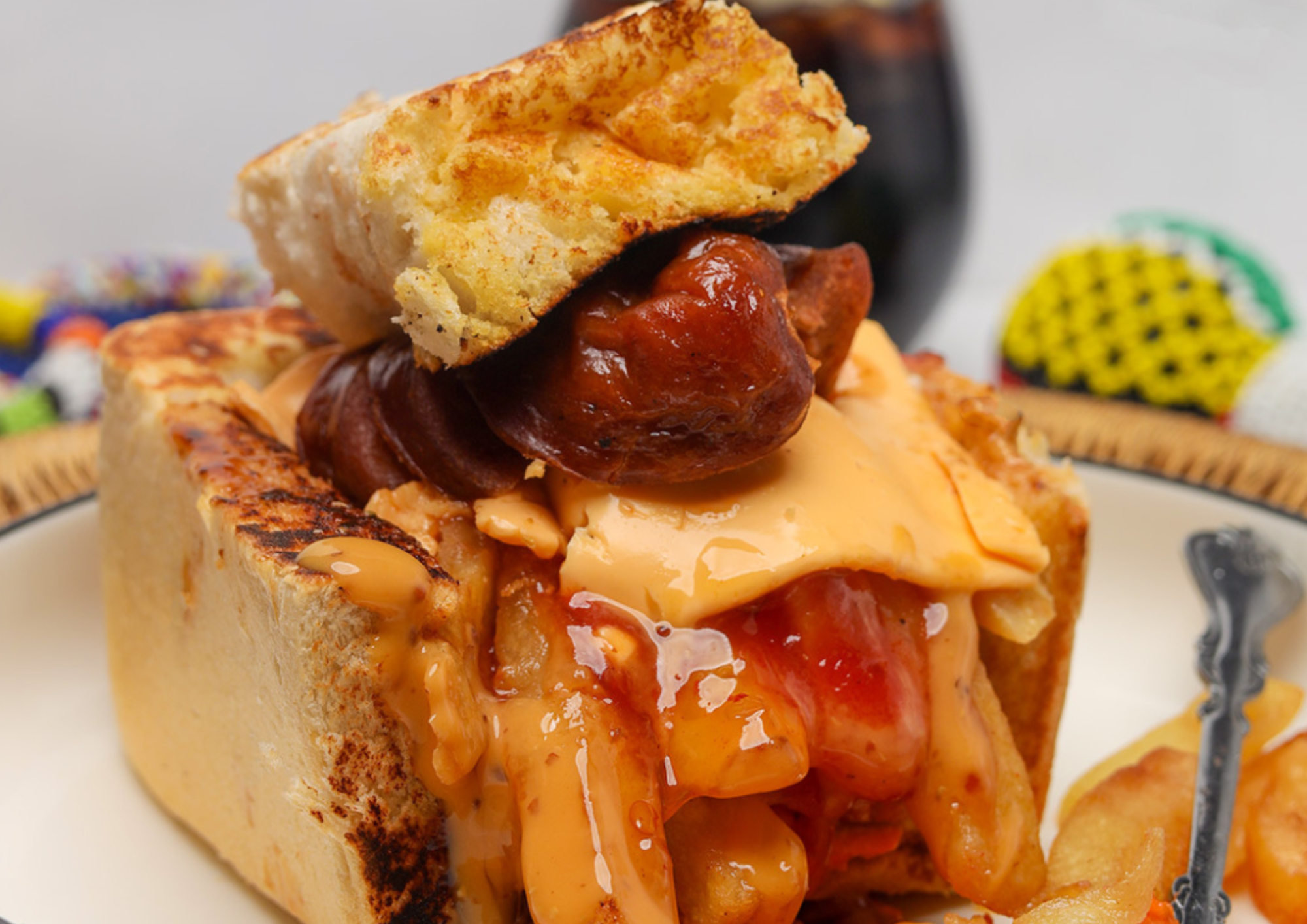 A delicious South African kota packed with crispy chips, polony, cheese, russian sausage, egg, and your choice of archaar or chakalaka, all topped with our special secret sauce for the perfect flavour.